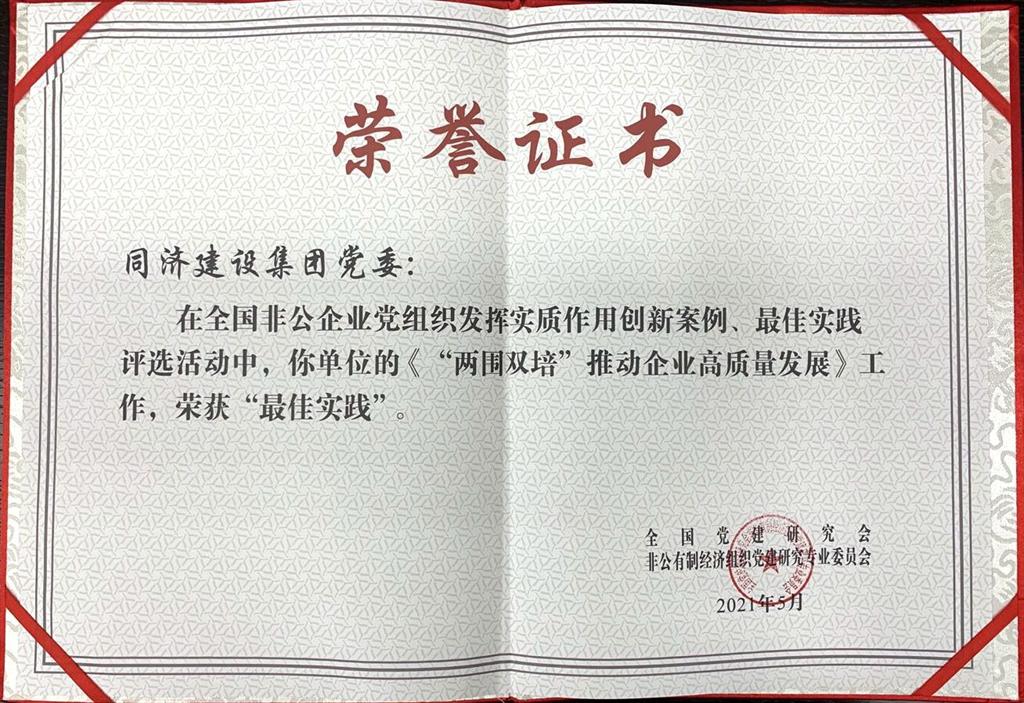 近日,以“聚焦高質量、助推新發展”為主題的全國非公企業黨組織“發揮實質作用”研討會在浙江溫州舉行。在上級黨組織的指導下,同濟建設集團黨委提交的《“兩圍雙培”推動企業高質量發展》課題榮獲全國非公企業黨組織發揮實質性作用“最佳實踐”獎,這是同濟集團黨組織成立并遷至合肥市蜀山區以來獲得的第一個全國性榮譽。