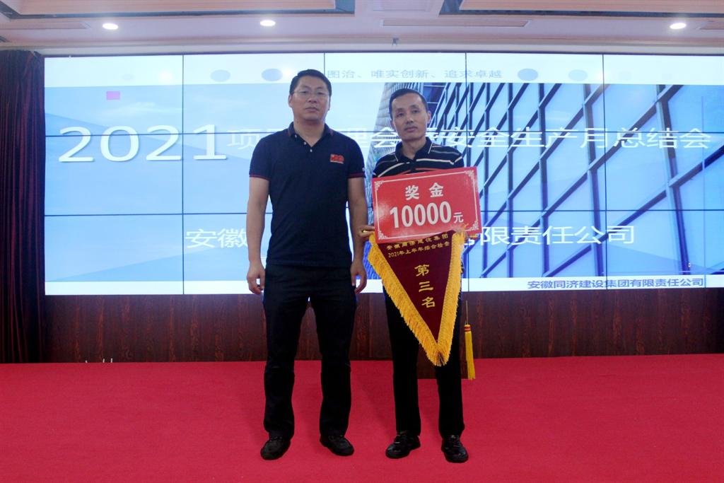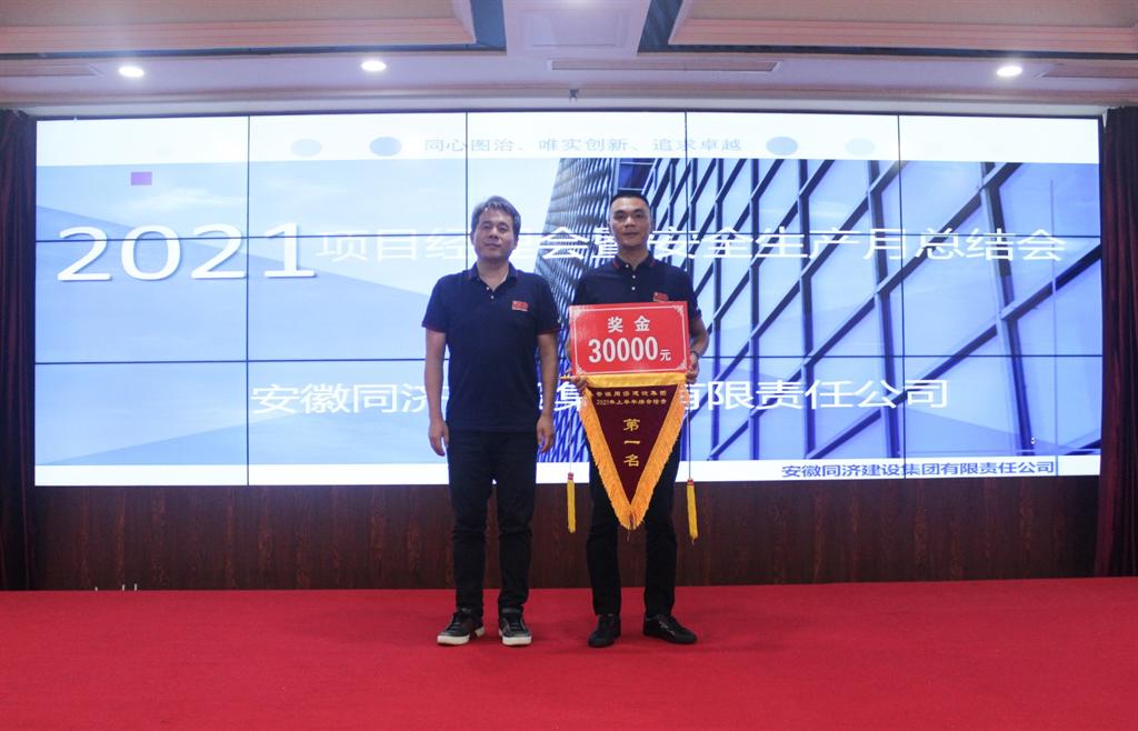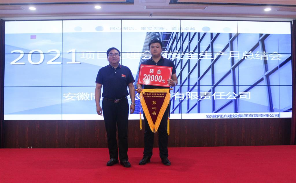 黨委副書記、董事、總經(jīng)理高先志為第三名頒獎阜陽新城紅郡項目代表李正東領(lǐng)獎 吳曉東指出,今年上半年,集團經(jīng)營風(fēng)險控制得當,資產(chǎn)總量持續(xù)增長,以穩(wěn)中向好的態(tài)勢進入“下半場”。這些成績的取得,離不開全體同濟人上下一心、左右齊一的付出。吳曉東提出幾點希望與要求:一是牢記安全生產(chǎn)理念。安全問題無小事,各項目部、單位要弘揚“生命至上、安全第一”的思想,壓實安全責(zé)任,做到安全生產(chǎn)警鐘長鳴;二是“嚴”字當頭,強化事前風(fēng)險管控。以合約規(guī)劃為抓手,加強項目安全、財務(wù)安全的事前控制,將風(fēng)險消滅在萌芽狀態(tài);三是持續(xù)推進管理機制規(guī)范化、專業(yè)化、標準化。要求各在建項目規(guī)范勞務(wù)用工,積極推進工法、QC課題等技術(shù)成果在項目落地。 吳曉東表示,當下國家高度重視民營經(jīng)濟發(fā)展,建筑業(yè)正從傳統(tǒng)型、粗放式發(fā)展逐步邁向高質(zhì)量、高效益的精品建筑、智慧建筑時代。立足新起點的同濟,將不忘初心,牢記使命,搶占合肥城市總體規(guī)劃新布局,搶抓安徽自貿(mào)試驗區(qū)、國家級經(jīng)濟技術(shù)開發(fā)區(qū)發(fā)展新機遇,揚帆十四五,形成“立足安徽,布局全國,開拓國際”的市場格局。希望各工程項目部和全體同濟人強化主體責(zé)任意識,規(guī)范項目管理,共同提升項目管理水平,以嶄新的姿態(tài)開啟同濟高質(zhì)量發(fā)展的新篇章!
