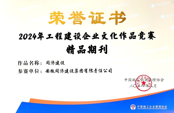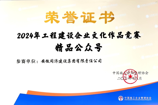9月4日至6日,2024年工程建設(shè)企業(yè)文化建設(shè)成果交流會(huì)在南京召開,中國(guó)施工企業(yè)管理協(xié)會(huì)發(fā)布了2024年工程建設(shè)企業(yè)文化建設(shè)系列活動(dòng)成果。同濟(jì)集團(tuán)期刊《同濟(jì)建設(shè)》獲評(píng)“2024年工程建設(shè)企業(yè)文化作品競(jìng)賽精品期刊”,“安徽同濟(jì)建設(shè)集團(tuán)”微信公眾號(hào)獲評(píng)“2024年工程建設(shè)企業(yè)文化作品競(jìng)賽精品公眾號(hào)”,企業(yè)官方網(wǎng)站獲評(píng)“2024年工程建設(shè)企業(yè)文化作品競(jìng)賽優(yōu)秀網(wǎng)站”。