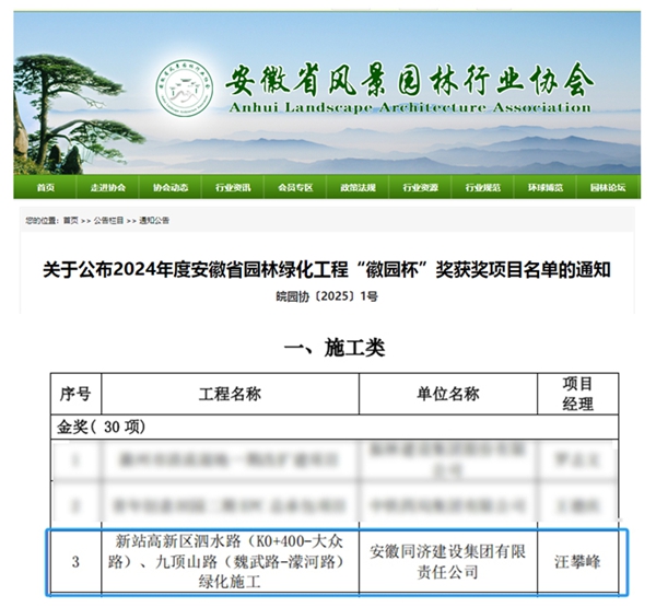 近日來,同濟集團喜報頻傳!在安徽省風景園林行業協會發布的《關于公布2024年度安徽省園林綠化工程“徽園杯”獎獲獎項目名單的通知》中,同濟集團承建的新站高新區泗水路(K0+400-大眾路)、九頂山路(魏武路-濛河路)綠化施工工程榮獲2024年度安徽省園林綠化工程“徽園杯”施工類金獎。 據了解,“徽園杯”獎是安徽省風景園林行業在工程質量、規劃設計等方面設置的獎項,旨在提升全省風景園林規劃、設計、施工水平,為推進生態強省、美好安徽建設作出貢獻。