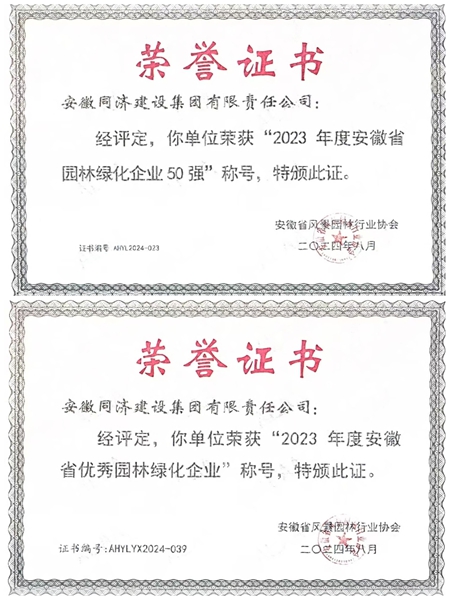 此前,同濟集團曾榮獲“2023年度安徽省園林綠化企業50強”“2023年度安徽省優秀園林綠化企業”稱號。(文/同濟路橋公司 楊園園) |