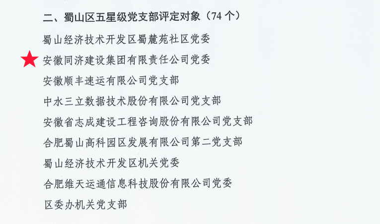 安徽同濟(jì)建設(shè)集團(tuán)有限責(zé)任公司黨委獲評蜀山區(qū)五星級黨支部[ 作者:陳鎣喬 點(diǎn)擊數(shù):4395 更新時間:2022/12/29] 日前,中共合肥市蜀山區(qū)委組織部印發(fā)了《關(guān)于評定蜀山區(qū)四、五星級黨支部的通報》,安徽同濟(jì)建設(shè)集團(tuán)有限責(zé)任公司黨委獲評蜀山區(qū)五星級黨支部。 安徽同濟(jì)建設(shè)集團(tuán)黨總支成立于2007年3月,2011年1月成立黨委。同濟(jì)集團(tuán)黨委堅持貫徹學(xué)習(xí)習(xí)近平新時代中國特色社會主義思想、落實(shí)新時代黨的建設(shè)總要求,全面加強(qiáng)自身建設(shè),充分發(fā)揮黨委在企業(yè)發(fā)展過程中的政治引領(lǐng)作用與政治核心作用,緊密圍繞生產(chǎn)經(jīng)營中心工作,總結(jié)提煉出“1155”黨群工作體系,堅持黨建引領(lǐng),落實(shí)“兩圍雙培”黨建工作制度,打造“雙強(qiáng)六好”企業(yè)黨組織,全面加強(qiáng)“服務(wù)型”基層黨組織建設(shè),倡導(dǎo)全員踐行同濟(jì)“信·德”文化,積極探索實(shí)踐非公企業(yè)黨群工作的新途徑、新思路和新方法,走出了一條具有同濟(jì)特色的非公黨群工作之路。同濟(jì)集團(tuán)黨委先后榮獲全國非公黨建發(fā)揮實(shí)質(zhì)性作用最佳實(shí)踐獎、省級“雙強(qiáng)六好”非公企業(yè)黨組織、省級非公經(jīng)濟(jì)和社會組織黨建工作示范點(diǎn)等多項(xiàng)榮譽(yù)。